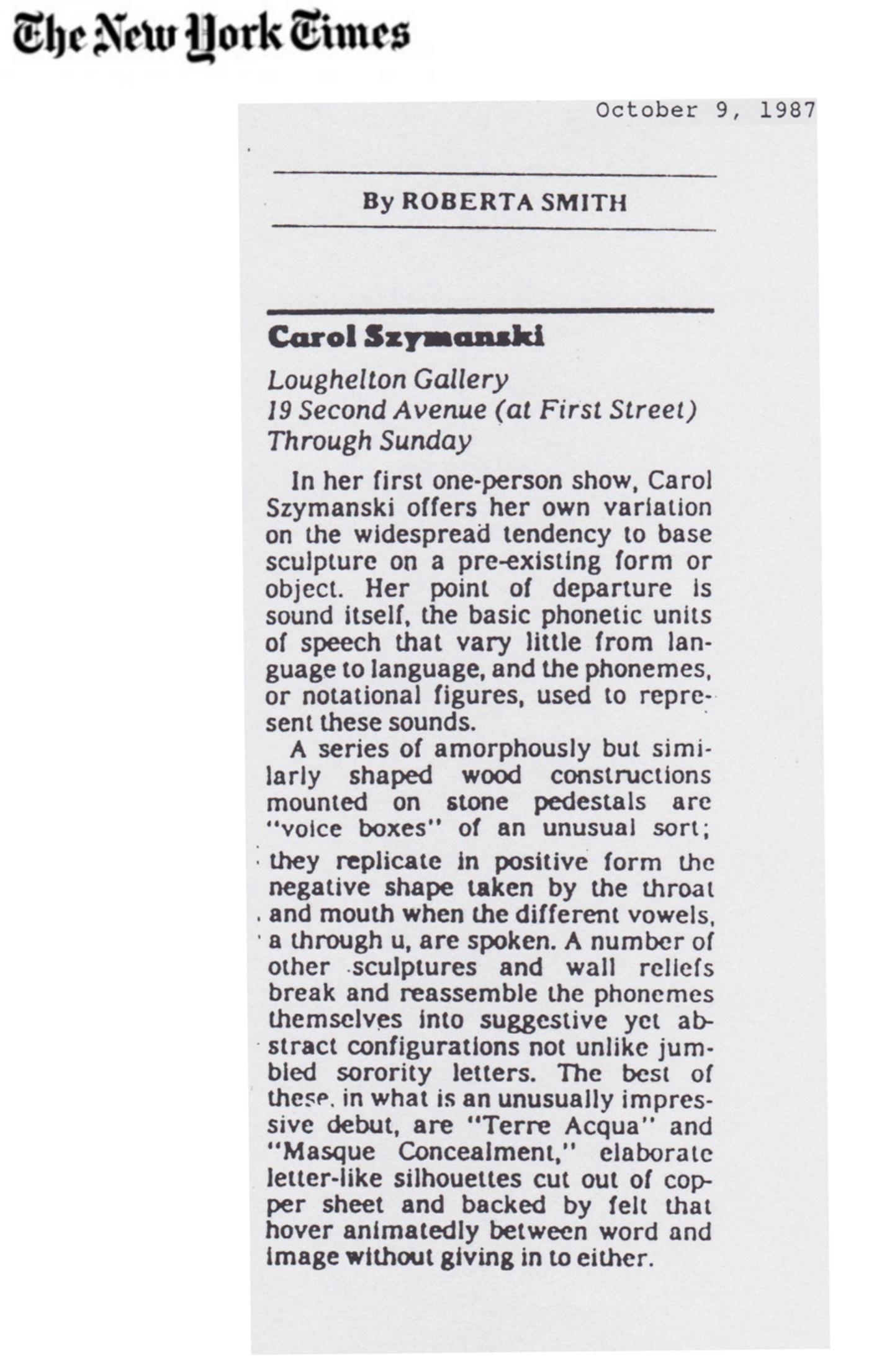 Carol Szymanski by Roberta Smith, the New York Times, October 9th, 1987